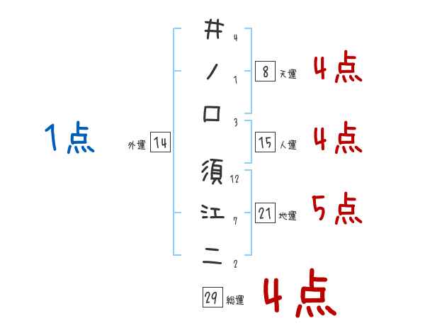 総運![]() | 井ノ口須江二さんの総運は29画の4つ星!完全主義で才能がある。厳格な心の持ち主。 あなたの人生を表す1番重要な運勢です。生涯を通じて影響する総合運となり、主に50歳以降の晩年期に影響を及ぼします。 |