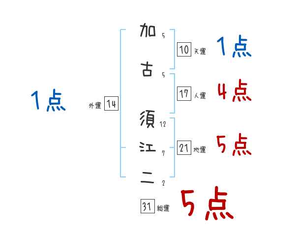 外運![]() | 加古須江二さんの外運は14画の1つ星!人に対して優しいがストレスを溜め込みがち。人間関係のトラブルを避けるよう気をつけましょう。 生活面を象徴する運勢です。外部から受ける影響力を表し、結婚運、家庭運や職場、環境への順応性を表します。 |