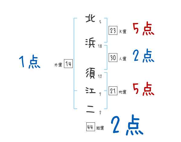天運![]() | 北浜須江二さんの天運は23画の5つ星!想像力に優れ活力がある。一代で成功し名誉を手に入れる。 家系が持つ宿命的な運勢を表します。祖先から受け継いだ苗字ですので自分の力が及びません。家柄を象徴します。 |