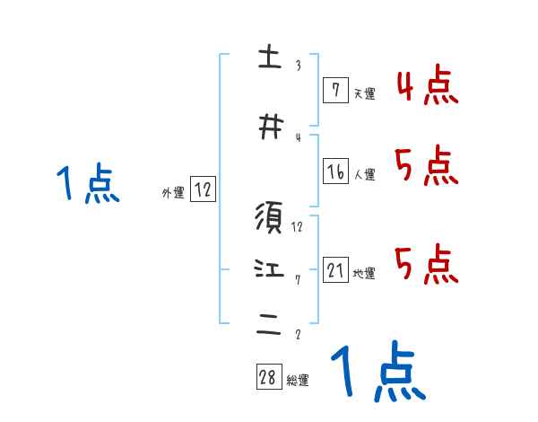 人運![]() | 土井須江二さんの人運は16画の5つ星!人望が厚く大きく発展する。逆転成功が見える。 性格や才能などを表す2番目に重要な運勢です。人間関係や協調性、社会的な成功に影響します。主に20歳から50歳ぐらいまでの中年期の運勢を表します。 |