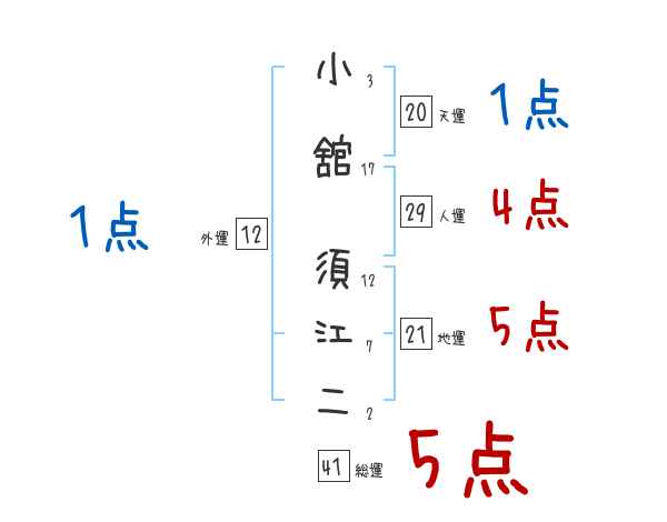 外運![]() | 小舘須江二さんの外運は12画の1つ星!簡単な失敗で諦めてしまいやすいかも。着実に行動すると良いでしょう。 生活面を象徴する運勢です。外部から受ける影響力を表し、結婚運、家庭運や職場、環境への順応性を表します。 |