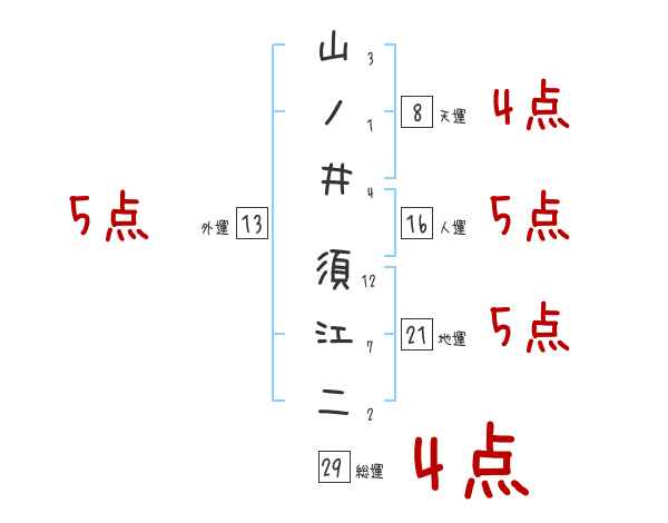 人運![]() | 山ノ井須江二さんの人運は16画の5つ星!人望が厚く大きく発展する。逆転成功が見える。 性格や才能などを表す2番目に重要な運勢です。人間関係や協調性、社会的な成功に影響します。主に20歳から50歳ぐらいまでの中年期の運勢を表します。 |