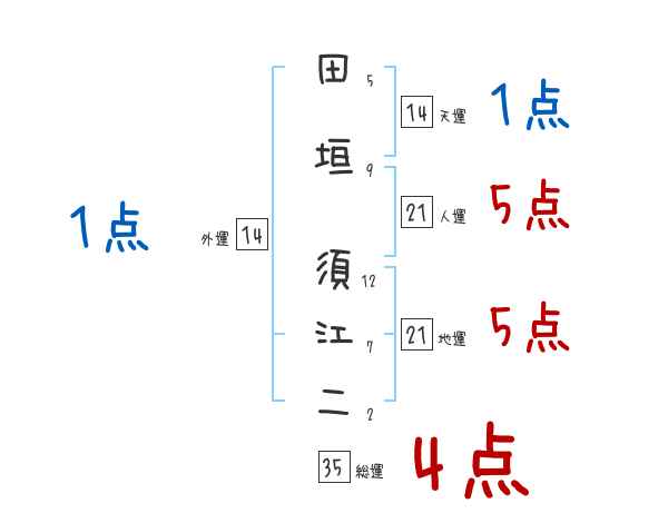 外運![]() | 田垣須江二さんの外運は14画の1つ星!人に対して優しいがストレスを溜め込みがち。人間関係のトラブルを避けるよう気をつけましょう。 生活面を象徴する運勢です。外部から受ける影響力を表し、結婚運、家庭運や職場、環境への順応性を表します。 |