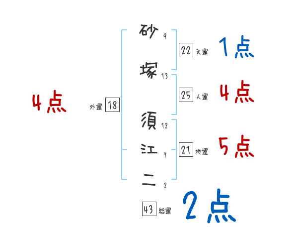 総運![]() | 砂塚須江二さんの総運は43画の2つ星!頑固な性格で独立心が強いかも。やや非現実的で浪費に注意しましょう。 あなたの人生を表す1番重要な運勢です。生涯を通じて影響する総合運となり、主に50歳以降の晩年期に影響を及ぼします。 |
