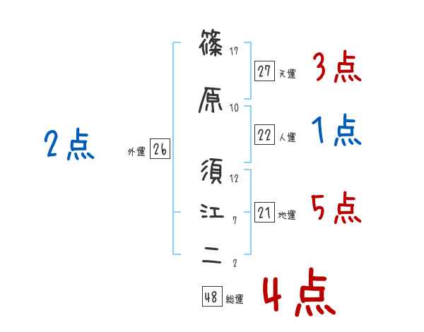 外運![]() | 篠原須江二さんの外運は26画の2つ星!波瀾万丈かも。信頼できる人を大事にしましょう。 生活面を象徴する運勢です。外部から受ける影響力を表し、結婚運、家庭運や職場、環境への順応性を表します。 |