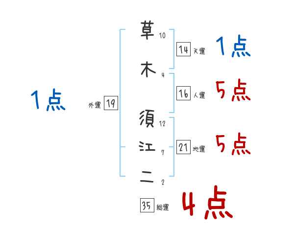 人運![]() | 草木須江二さんの人運は16画の5つ星!人望が厚く大きく発展する。逆転成功が見える。 性格や才能などを表す2番目に重要な運勢です。人間関係や協調性、社会的な成功に影響します。主に20歳から50歳ぐらいまでの中年期の運勢を表します。 |
