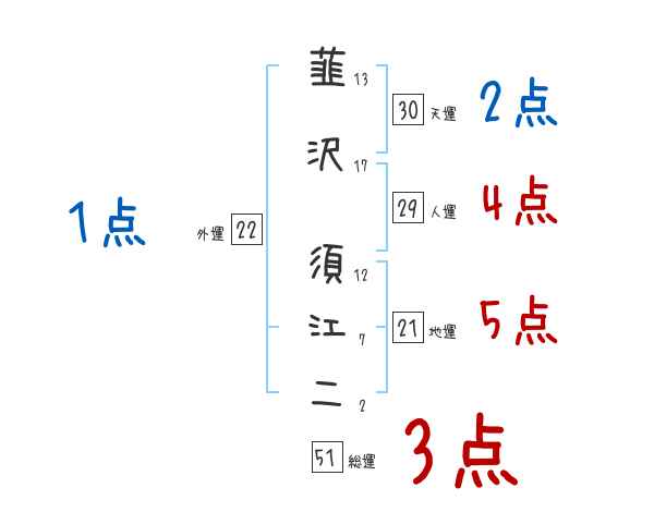 天運![]() | 韮沢須江二さんの天運は30画の2つ星!浮き沈みの激しさに注意しましょう。 家系が持つ宿命的な運勢を表します。祖先から受け継いだ苗字ですので自分の力が及びません。家柄を象徴します。 |