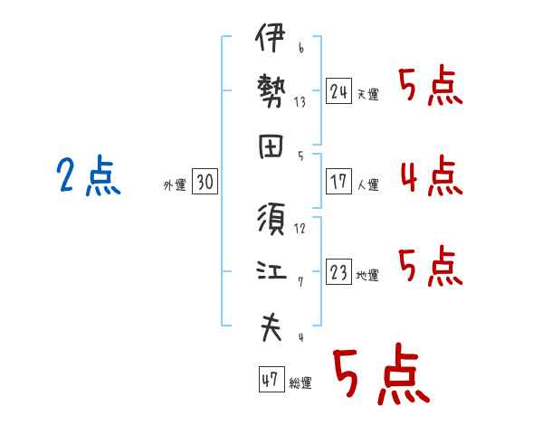 天運![]() | 伊勢田須江夫さんの天運は24画の5つ星!家庭運が良く順調な人生。金運にも恵まれる。 家系が持つ宿命的な運勢を表します。祖先から受け継いだ苗字ですので自分の力が及びません。家柄を象徴します。 |