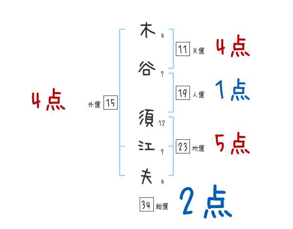 総運![]() | 木谷須江夫さんの総運は34画の2つ星!独創性に優れるが、自尊心が強く災難に注意しましょう。 あなたの人生を表す1番重要な運勢です。生涯を通じて影響する総合運となり、主に50歳以降の晩年期に影響を及ぼします。 |