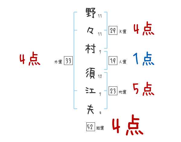 人運![]() | 野々村須江夫さんの人運は19画の1つ星!優れた才能を持ちますが、協調性が足りないことも。周りの人と協力する事を意識しましょう。 性格や才能などを表す2番目に重要な運勢です。人間関係や協調性、社会的な成功に影響します。主に20歳から50歳ぐらいまでの中年期の運勢を表します。 |