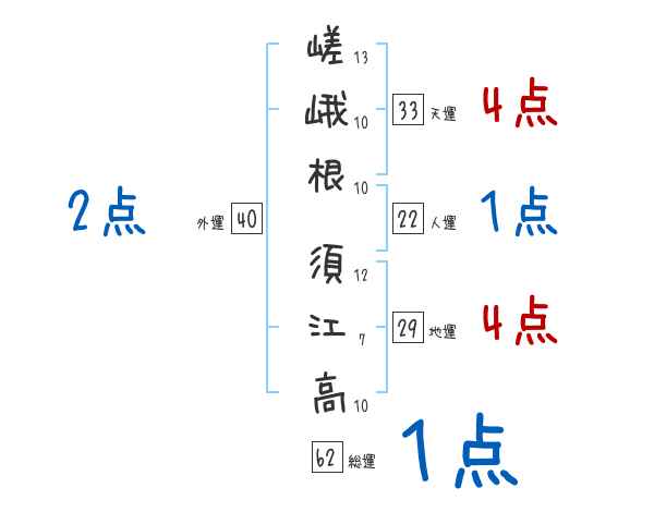 外運![]() | 嵯峨根須江高さんの外運は40画の2つ星!自信過剰で物事に固執するためトラブルに注意。 生活面を象徴する運勢です。外部から受ける影響力を表し、結婚運、家庭運や職場、環境への順応性を表します。 |