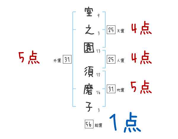 天運![]() | 室之園須磨子さんの天運は25画の4つ星!個性があり才能があふれる。強運の持ち主で発展する。 家系が持つ宿命的な運勢を表します。祖先から受け継いだ苗字ですので自分の力が及びません。家柄を象徴します。 |
