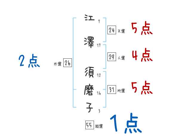 天運![]() | 江澤須磨子さんの天運は24画の5つ星!家庭運が良く順調な人生。金運にも恵まれる。 家系が持つ宿命的な運勢を表します。祖先から受け継いだ苗字ですので自分の力が及びません。家柄を象徴します。 |