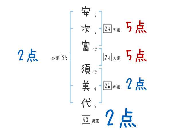 外運![]() | 安次富須美代さんの外運は26画の2つ星!波瀾万丈かも。信頼できる人を大事にしましょう。 生活面を象徴する運勢です。外部から受ける影響力を表し、結婚運、家庭運や職場、環境への順応性を表します。 |