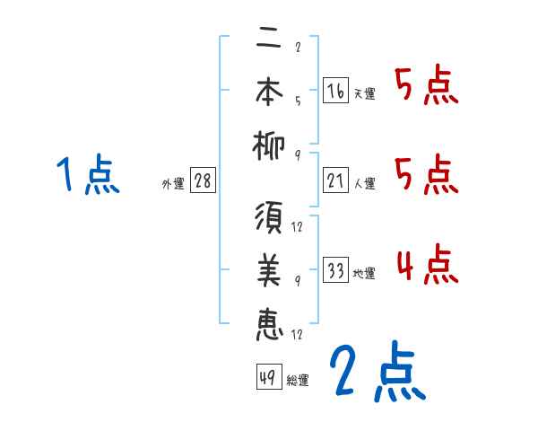 天運![]() | 二本柳須美恵さんの天運は16画の5つ星!人望が厚く大きく発展する。逆転成功が見える。 家系が持つ宿命的な運勢を表します。祖先から受け継いだ苗字ですので自分の力が及びません。家柄を象徴します。 |