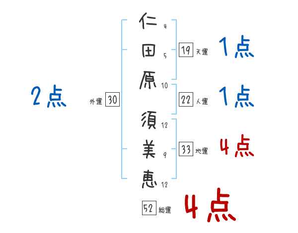 人運![]() | 仁田原須美恵さんの人運は22画の1つ星!努力することが苦手ないっぽう手先が器用。芸術性にも優れる。 性格や才能などを表す2番目に重要な運勢です。人間関係や協調性、社会的な成功に影響します。主に20歳から50歳ぐらいまでの中年期の運勢を表します。 |