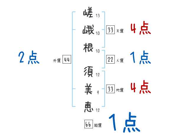 総運![]() | 嵯峨根須美恵さんの総運は66画の1つ星!迷うことが多く挫折しやすい傾向が。辛抱強く物事に取り組みましょう。 あなたの人生を表す1番重要な運勢です。生涯を通じて影響する総合運となり、主に50歳以降の晩年期に影響を及ぼします。 |