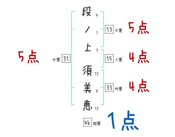 天運![]() | 段ノ上須美恵さんの天運は13画の5つ星!才能に恵まれ人気がある。名声を手に入れる。円満な人生。 家系が持つ宿命的な運勢を表します。祖先から受け継いだ苗字ですので自分の力が及びません。家柄を象徴します。 |