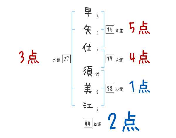 天運![]() | 早矢仕須美江さんの天運は16画の5つ星!人望が厚く大きく発展する。逆転成功が見える。 家系が持つ宿命的な運勢を表します。祖先から受け継いだ苗字ですので自分の力が及びません。家柄を象徴します。 |