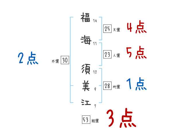 総運![]() | 福海須美江さんの総運は53画の3つ星!やや見栄っ張りで虚栄心がある。散財に注意。 あなたの人生を表す1番重要な運勢です。生涯を通じて影響する総合運となり、主に50歳以降の晩年期に影響を及ぼします。 |