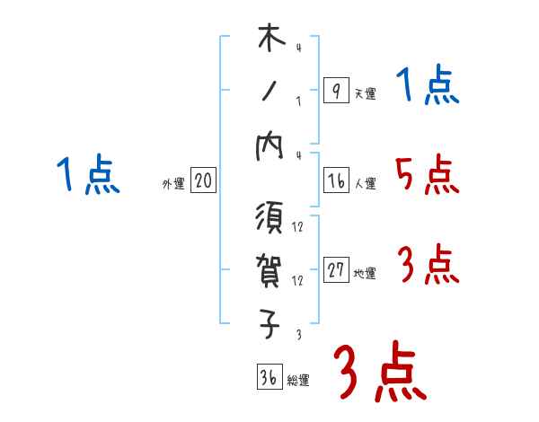 天運![]() | 木ノ内須賀子さんの天運は9画の1つ星!消極的で才能を発揮することが苦手なことも。周りの意見に耳を傾けましょう。 家系が持つ宿命的な運勢を表します。祖先から受け継いだ苗字ですので自分の力が及びません。家柄を象徴します。 |