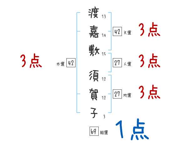 地運![]() | 渡嘉敷須賀子さんの地運は27画の3つ星!頭脳明晰だが強情で摩擦が多い傾向。孤立に注意。 個性を表す基礎的な運勢です。性格形成や対人関係、行動力など家庭環境に影響されます。主に誕生してから20歳くらいまでの若年期の運勢を表します。 |