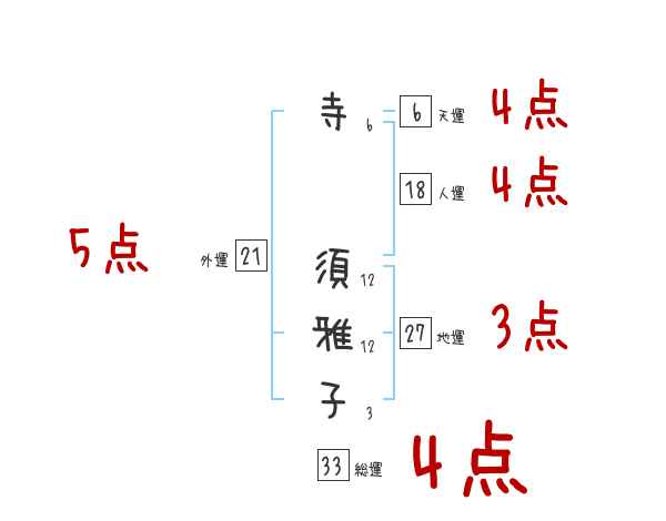 天運![]() | 寺須雅子さんの天運は6画の4つ星!慎重な努力家で信頼を得る。誠実な精神で向上心に優れる。 家系が持つ宿命的な運勢を表します。祖先から受け継いだ苗字ですので自分の力が及びません。家柄を象徴します。 |
