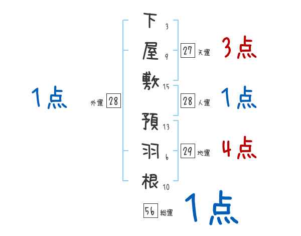 外運![]() | 下屋敷預羽根さんの外運は28画の1つ星!家庭環境に注意。スポーツで活躍できる能力があるかも。 生活面を象徴する運勢です。外部から受ける影響力を表し、結婚運、家庭運や職場、環境への順応性を表します。 |