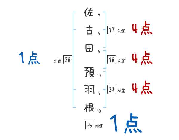 総運![]() | 佐古田預羽根さんの総運は46画の1つ星!迷走することが多く苦労するかも。目先のことにとらわれないように。 あなたの人生を表す1番重要な運勢です。生涯を通じて影響する総合運となり、主に50歳以降の晩年期に影響を及ぼします。 |