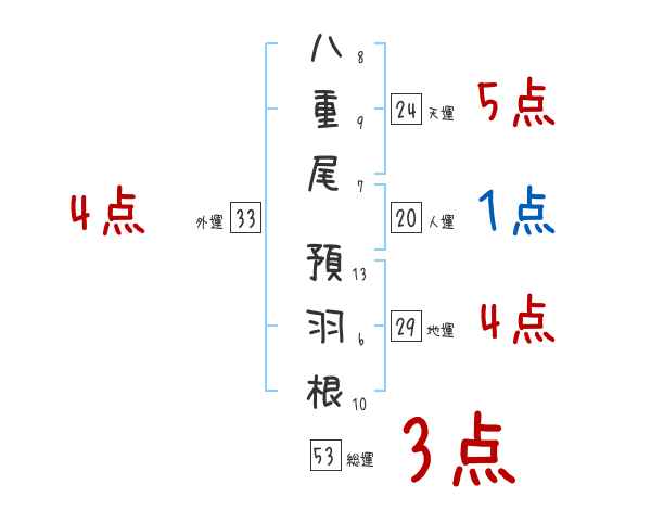 八重尾預羽根さんの画数の鑑定結果