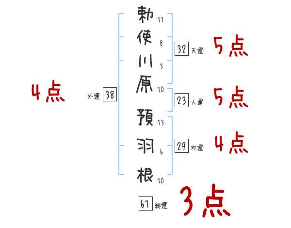 勅使川原預羽根さんの外運は38画の4つ星