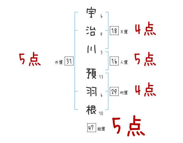総運![]() | 宇治川預羽根さんの総運は47画の5つ星!実力が開花し発展する円満な人生。財に恵まれる。 あなたの人生を表す1番重要な運勢です。生涯を通じて影響する総合運となり、主に50歳以降の晩年期に影響を及ぼします。 |