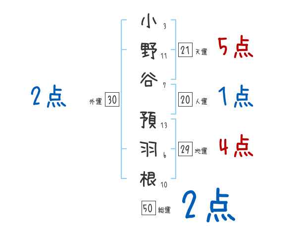 外運![]() | 小野谷預羽根さんの外運は30画の2つ星!浮き沈みの激しさに注意しましょう。 生活面を象徴する運勢です。外部から受ける影響力を表し、結婚運、家庭運や職場、環境への順応性を表します。 |