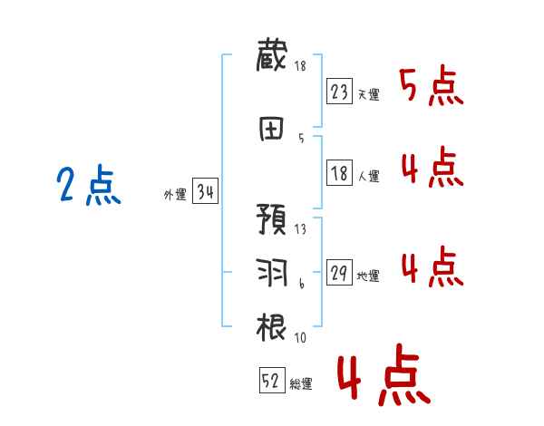 天運![]() | 蔵田預羽根さんの天運は23画の5つ星!想像力に優れ活力がある。一代で成功し名誉を手に入れる。 家系が持つ宿命的な運勢を表します。祖先から受け継いだ苗字ですので自分の力が及びません。家柄を象徴します。 |