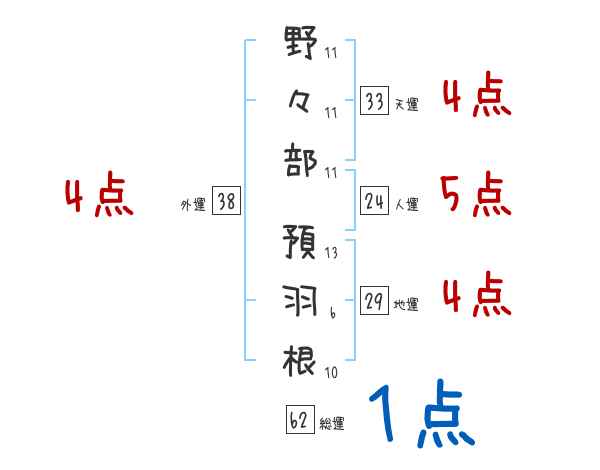天運![]() | 野々部預羽根さんの天運は33画の4つ星!権力志向でプライドが高い。勇気があり運を切り開き成功する。 家系が持つ宿命的な運勢を表します。祖先から受け継いだ苗字ですので自分の力が及びません。家柄を象徴します。 |
