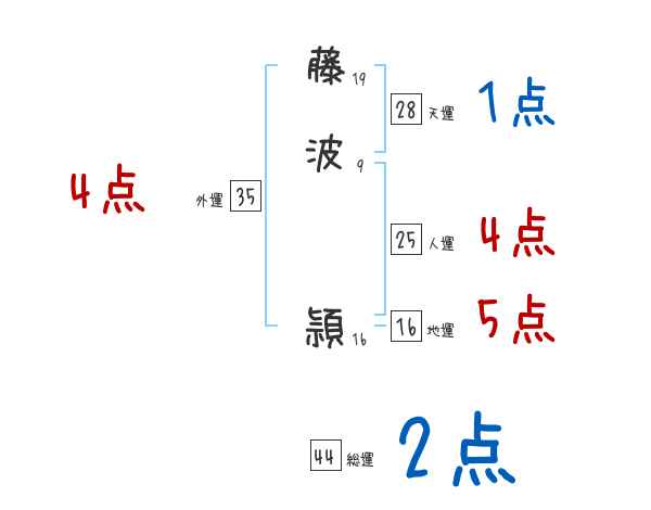 天運![]() | 藤波頴さんの天運は28画の1つ星!家庭環境に注意。スポーツで活躍できる能力があるかも。 家系が持つ宿命的な運勢を表します。祖先から受け継いだ苗字ですので自分の力が及びません。家柄を象徴します。 |