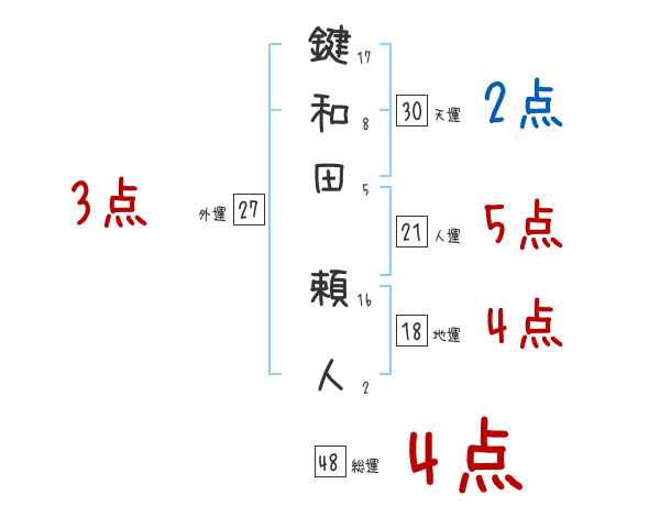人運![]() | 鍵和田頼人さんの人運は21画の5つ星!統率力がある。独立し成功する。名誉を手に入れる。 性格や才能などを表す2番目に重要な運勢です。人間関係や協調性、社会的な成功に影響します。主に20歳から50歳ぐらいまでの中年期の運勢を表します。 |