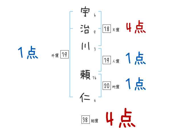 外運![]() | 宇治川頼仁さんの外運は19画の1つ星!優れた才能を持ちますが、協調性が足りないことも。周りの人と協力する事を意識しましょう。 生活面を象徴する運勢です。外部から受ける影響力を表し、結婚運、家庭運や職場、環境への順応性を表します。 |