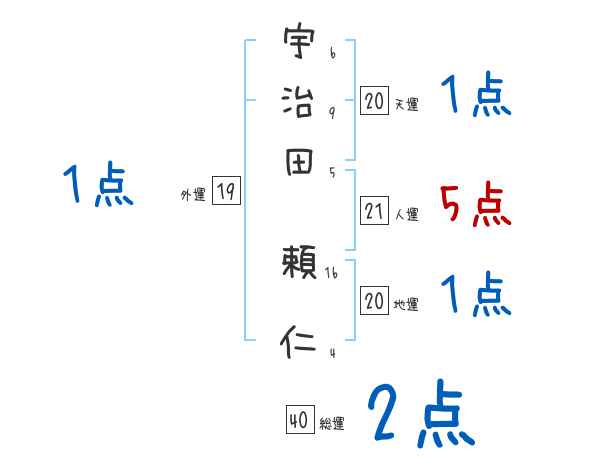 外運![]() | 宇治田頼仁さんの外運は19画の1つ星!優れた才能を持ちますが、協調性が足りないことも。周りの人と協力する事を意識しましょう。 生活面を象徴する運勢です。外部から受ける影響力を表し、結婚運、家庭運や職場、環境への順応性を表します。 |