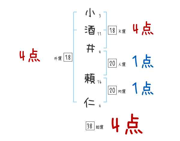 総運![]() | 小酒井頼仁さんの総運は38画の4つ星!温厚な性格で技術的な才能を発揮する。職人的な仕事に向いている。 あなたの人生を表す1番重要な運勢です。生涯を通じて影響する総合運となり、主に50歳以降の晩年期に影響を及ぼします。 |