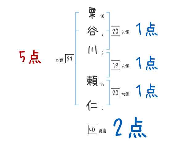 外運![]() | 栗谷川頼仁さんの外運は21画の5つ星!統率力がある。独立し成功する。名誉を手に入れる。 生活面を象徴する運勢です。外部から受ける影響力を表し、結婚運、家庭運や職場、環境への順応性を表します。 |