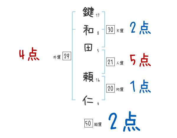 外運![]() | 鍵和田頼仁さんの外運は29画の4つ星!完全主義で才能がある。厳格な心の持ち主。 生活面を象徴する運勢です。外部から受ける影響力を表し、結婚運、家庭運や職場、環境への順応性を表します。 |