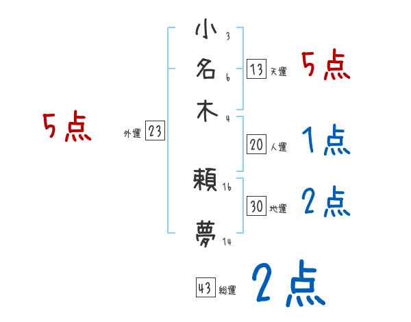 外運![]() | 小名木頼夢さんの外運は23画の5つ星!想像力に優れ活力がある。一代で成功し名誉を手に入れる。 生活面を象徴する運勢です。外部から受ける影響力を表し、結婚運、家庭運や職場、環境への順応性を表します。 |
