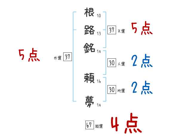 外運![]() | 根路銘頼夢さんの外運は37画の5つ星!努力家で順応性に優れる。現実的な考え方ができ忠実に物事をこなす。 生活面を象徴する運勢です。外部から受ける影響力を表し、結婚運、家庭運や職場、環境への順応性を表します。 |