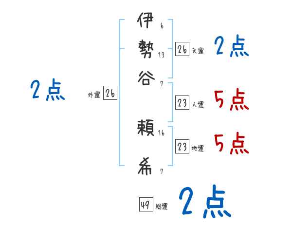 天運![]() | 伊勢谷頼希さんの天運は26画の2つ星!波瀾万丈かも。信頼できる人を大事にしましょう。 家系が持つ宿命的な運勢を表します。祖先から受け継いだ苗字ですので自分の力が及びません。家柄を象徴します。 |