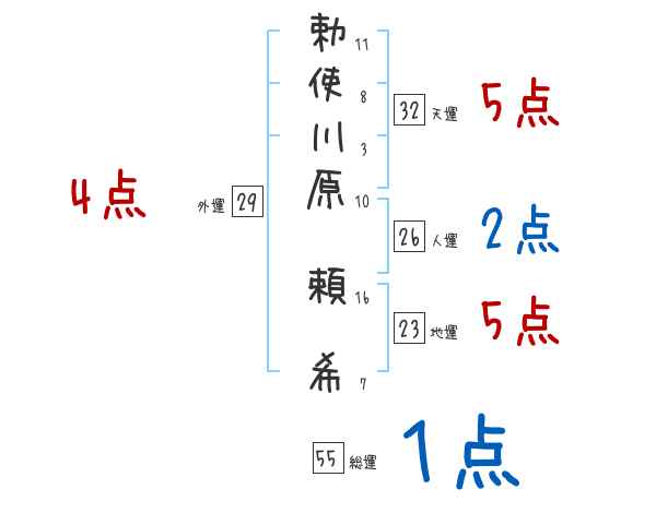 天運![]() | 勅使川原頼希さんの天運は32画の5つ星!柔軟性があり成功する。チャンスが多く金運が良い。 家系が持つ宿命的な運勢を表します。祖先から受け継いだ苗字ですので自分の力が及びません。家柄を象徴します。 |