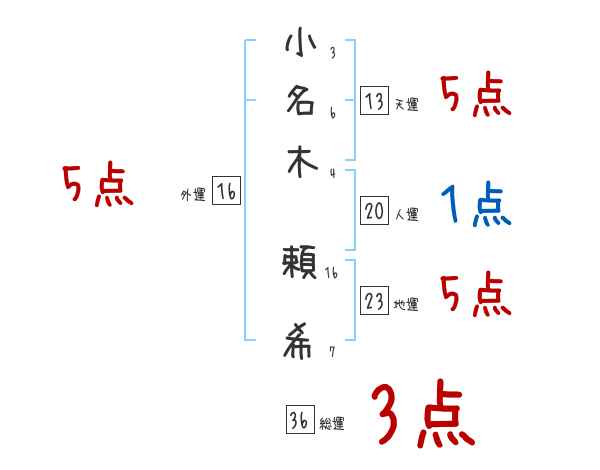 総運![]() | 小名木頼希さんの総運は36画の3つ星!先見性が豊かです。多少神経質で苦労することも。 あなたの人生を表す1番重要な運勢です。生涯を通じて影響する総合運となり、主に50歳以降の晩年期に影響を及ぼします。 |
