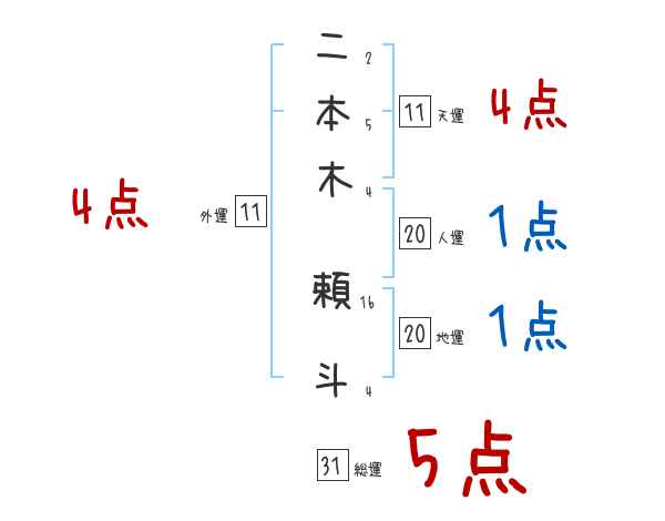 天運![]() | 二本木頼斗さんの天運は11画の4つ星!着実に富や地位を得る幸運な人生。 家系が持つ宿命的な運勢を表します。祖先から受け継いだ苗字ですので自分の力が及びません。家柄を象徴します。 |