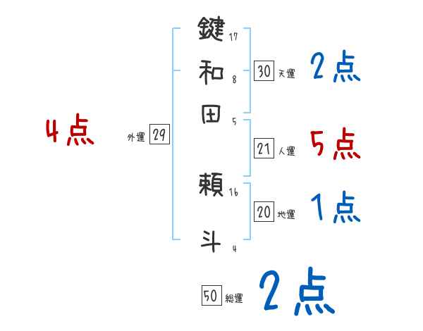 天運![]() | 鍵和田頼斗さんの天運は30画の2つ星!浮き沈みの激しさに注意しましょう。 家系が持つ宿命的な運勢を表します。祖先から受け継いだ苗字ですので自分の力が及びません。家柄を象徴します。 |