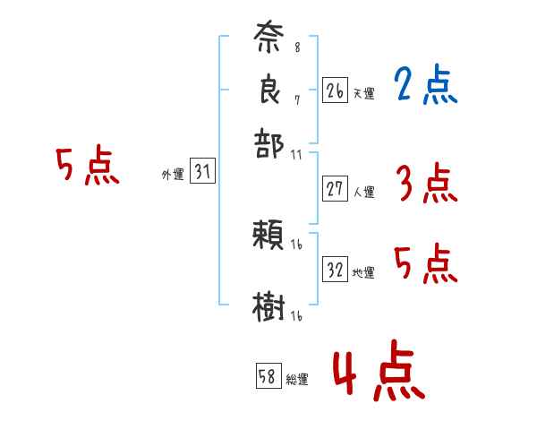 地運![]() | 奈良部頼樹さんの地運は32画の5つ星!柔軟性があり成功する。チャンスが多く金運が良い。 個性を表す基礎的な運勢です。性格形成や対人関係、行動力など家庭環境に影響されます。主に誕生してから20歳くらいまでの若年期の運勢を表します。 |